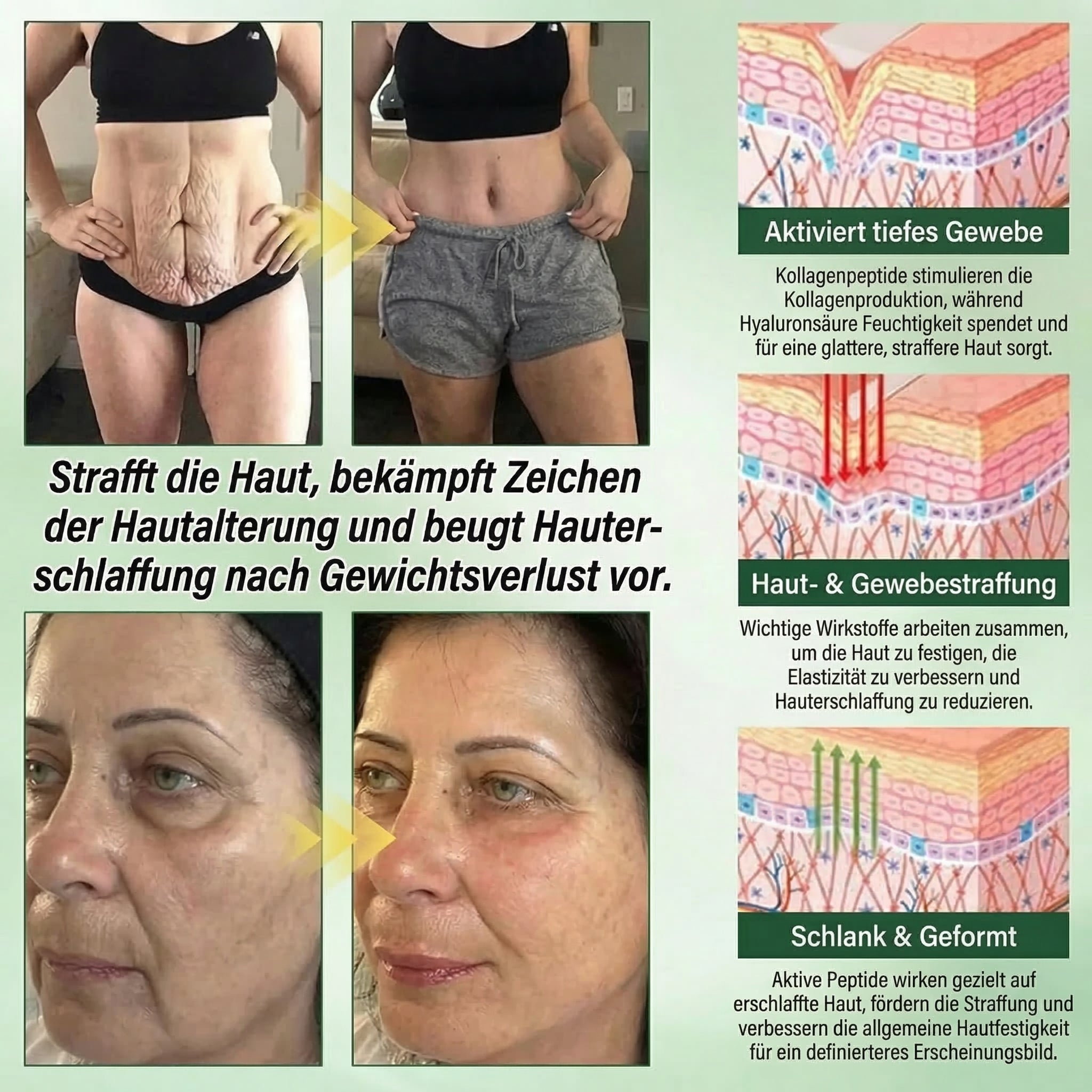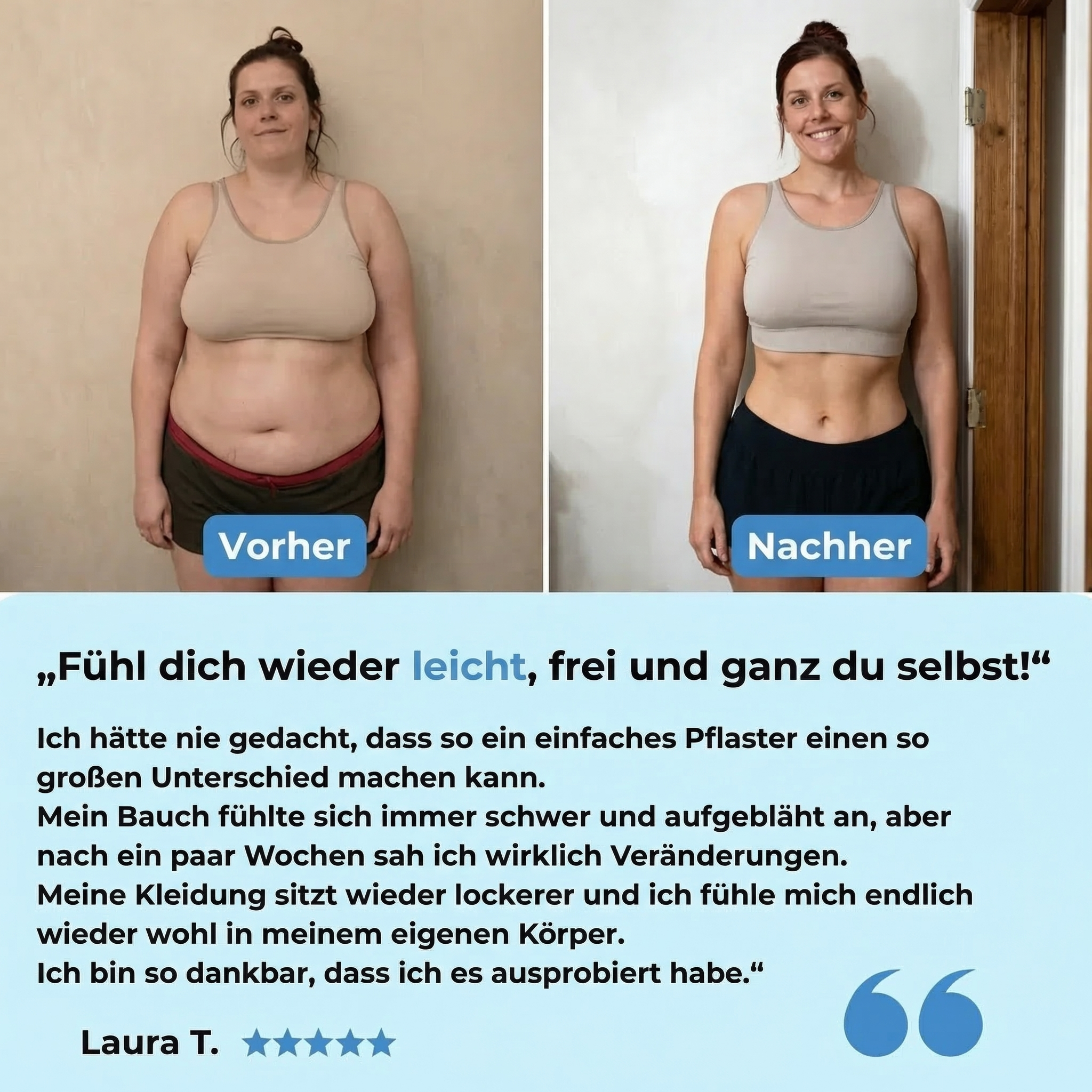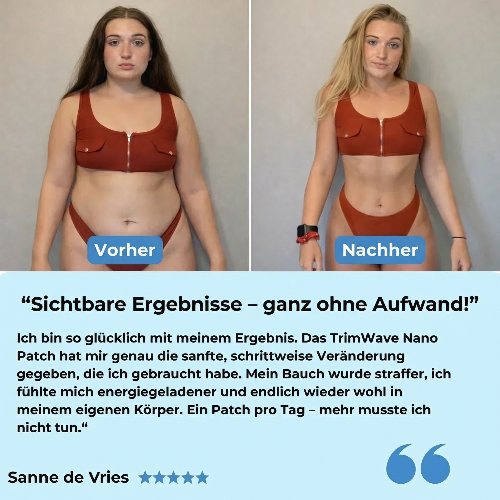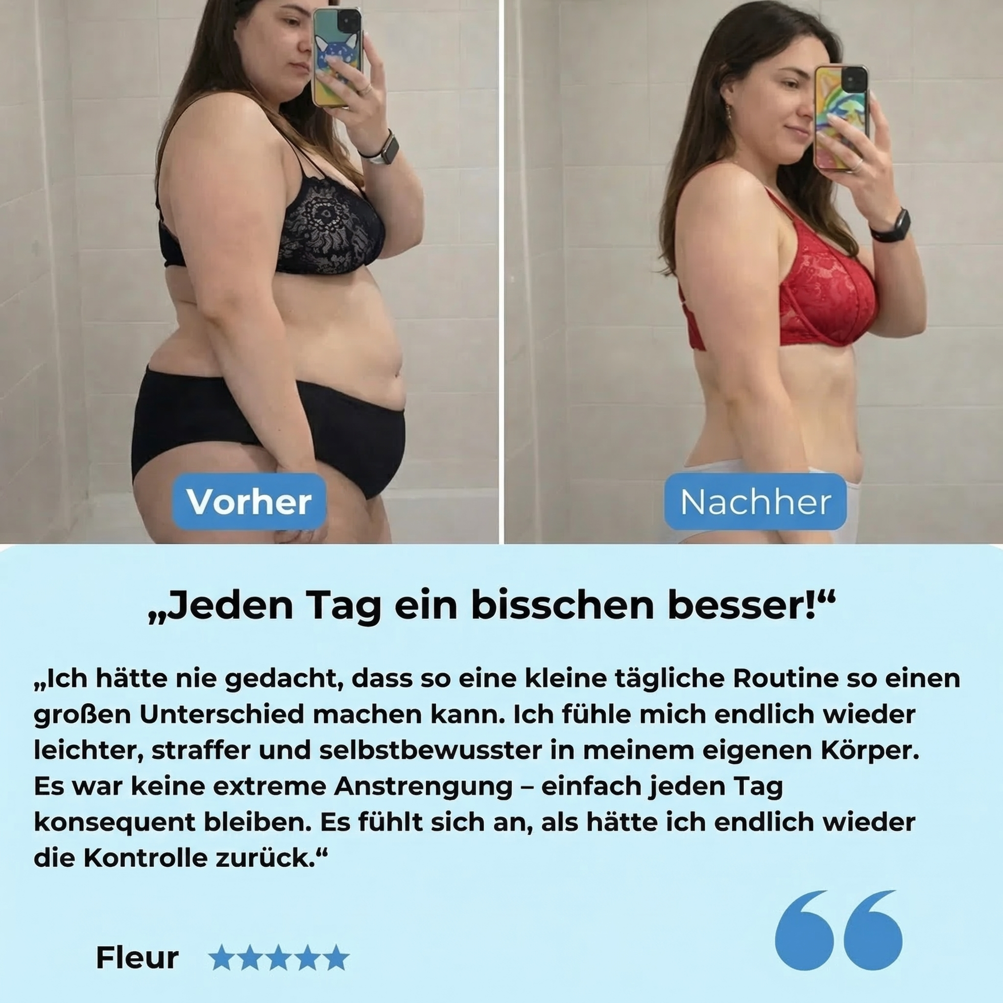 Gewichtsverlust ist nur ein Teil der Veränderung. Deine Haut braucht Zeit – und die richtige Unterstützung. Erst dann fühlt sich dein Körper wirklich im Gleichgewicht an und du erreichst echte Veränderung.
